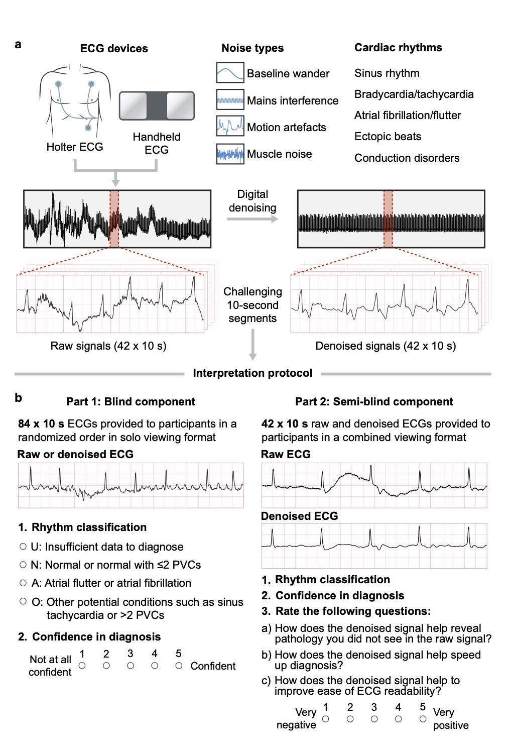 The study involved a diverse cohort of 48 healthcare professionals with a range of different experience levels, who assessed a series of single-lead ECG recordings using a blinded protocol that compared their ability to confidently diagnose cardiac rhythms with and without the aid of HeartKey denoising.
